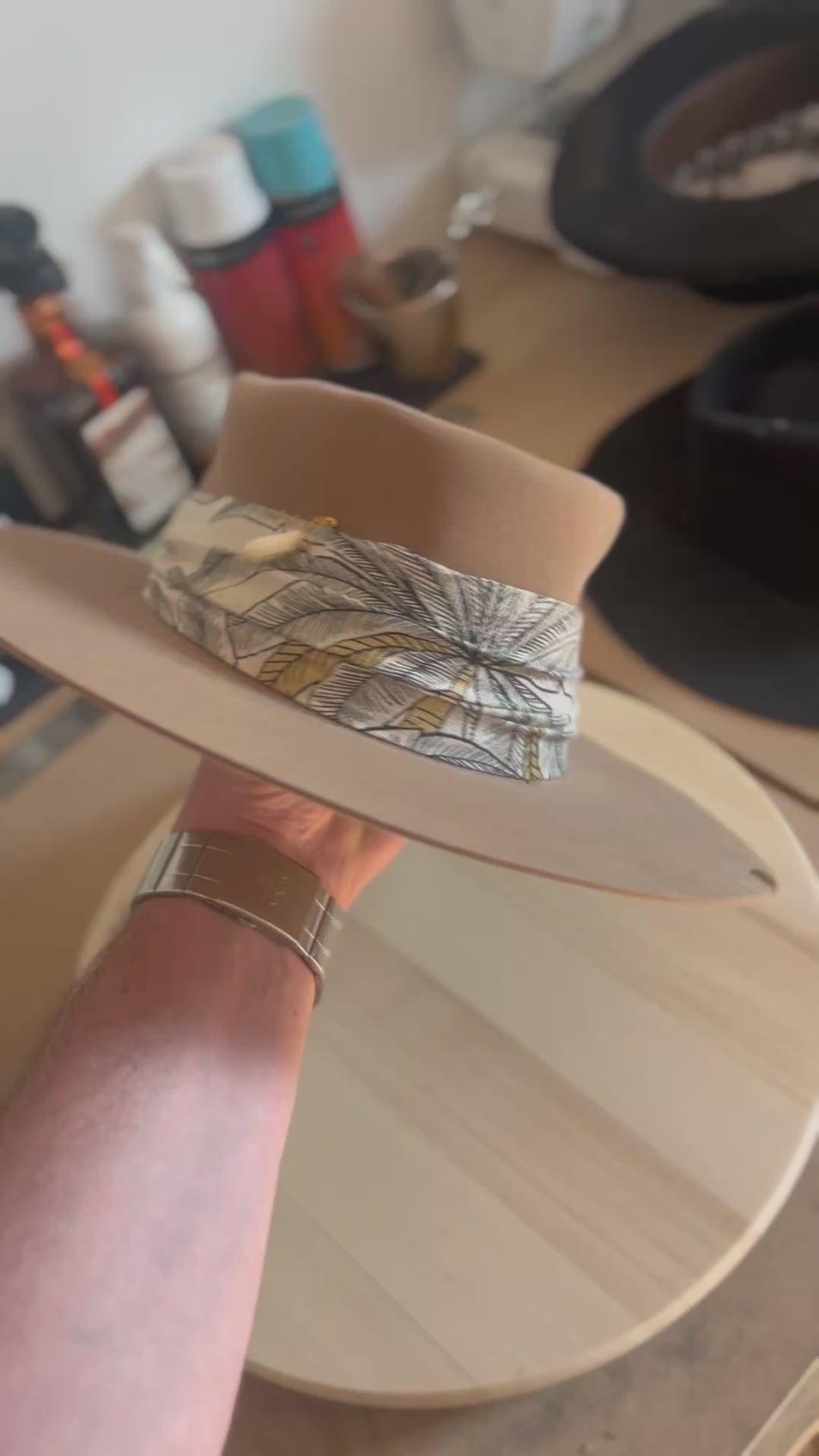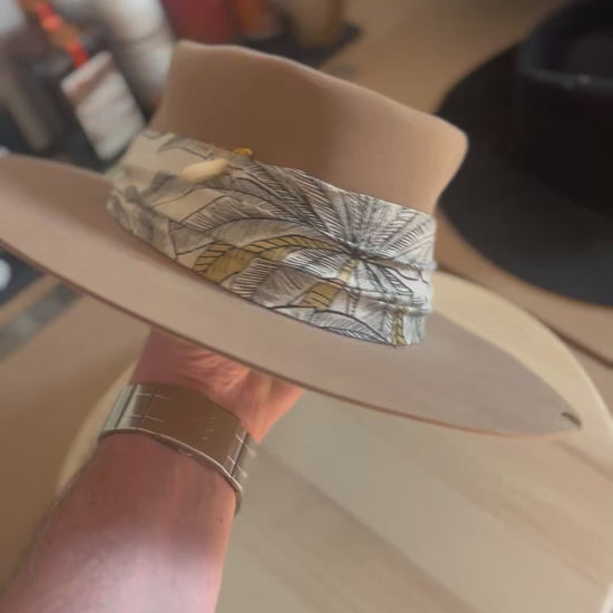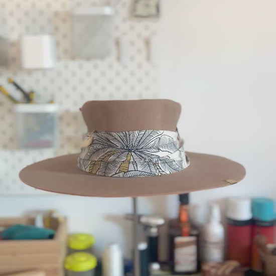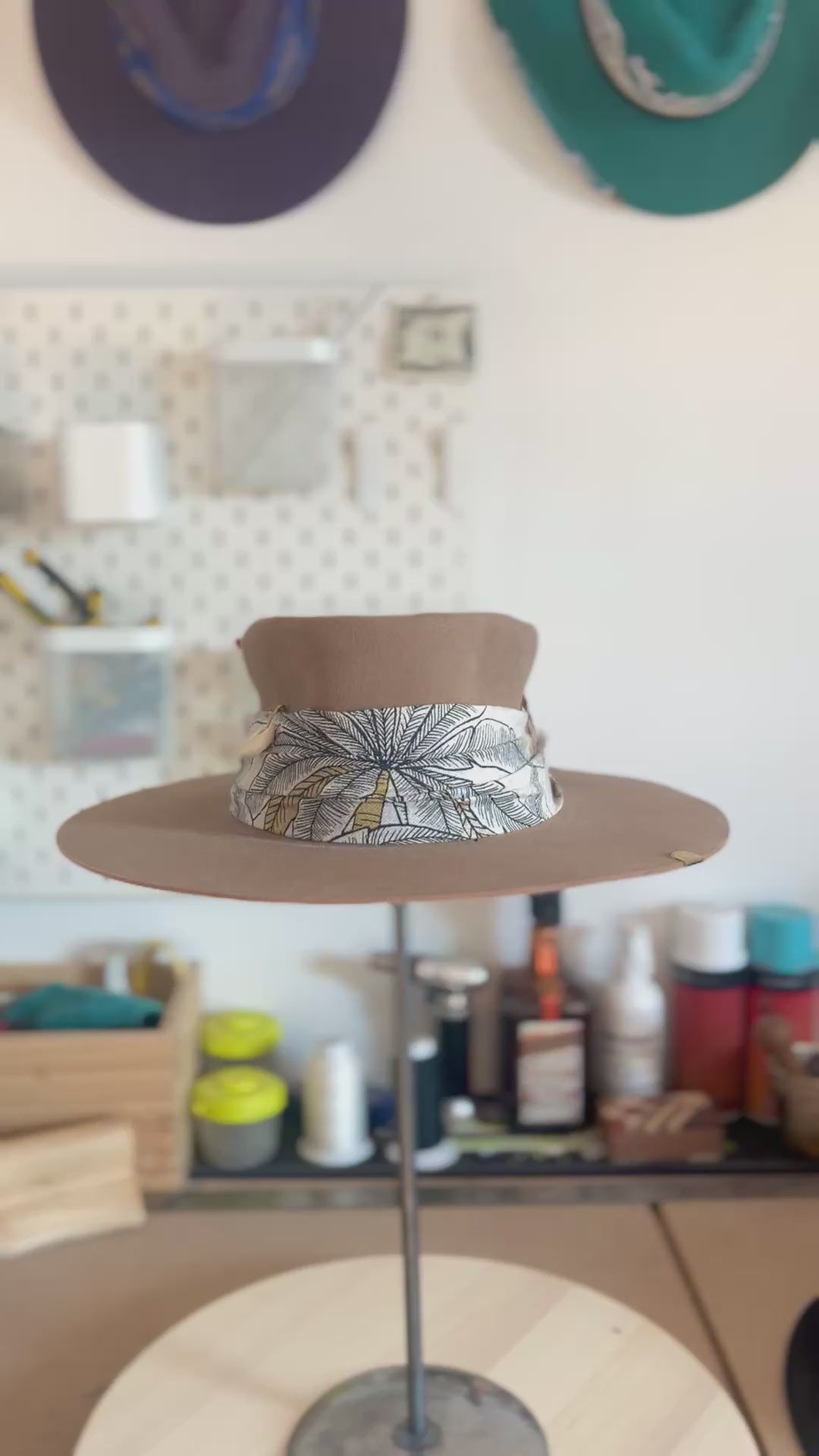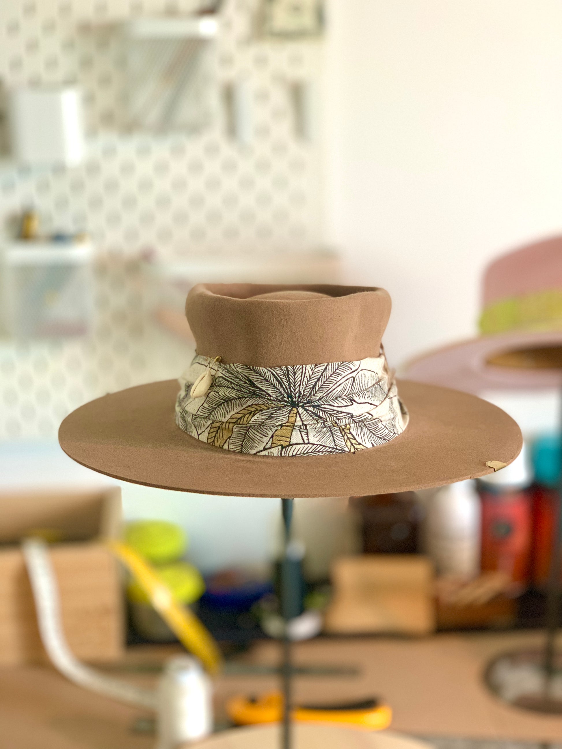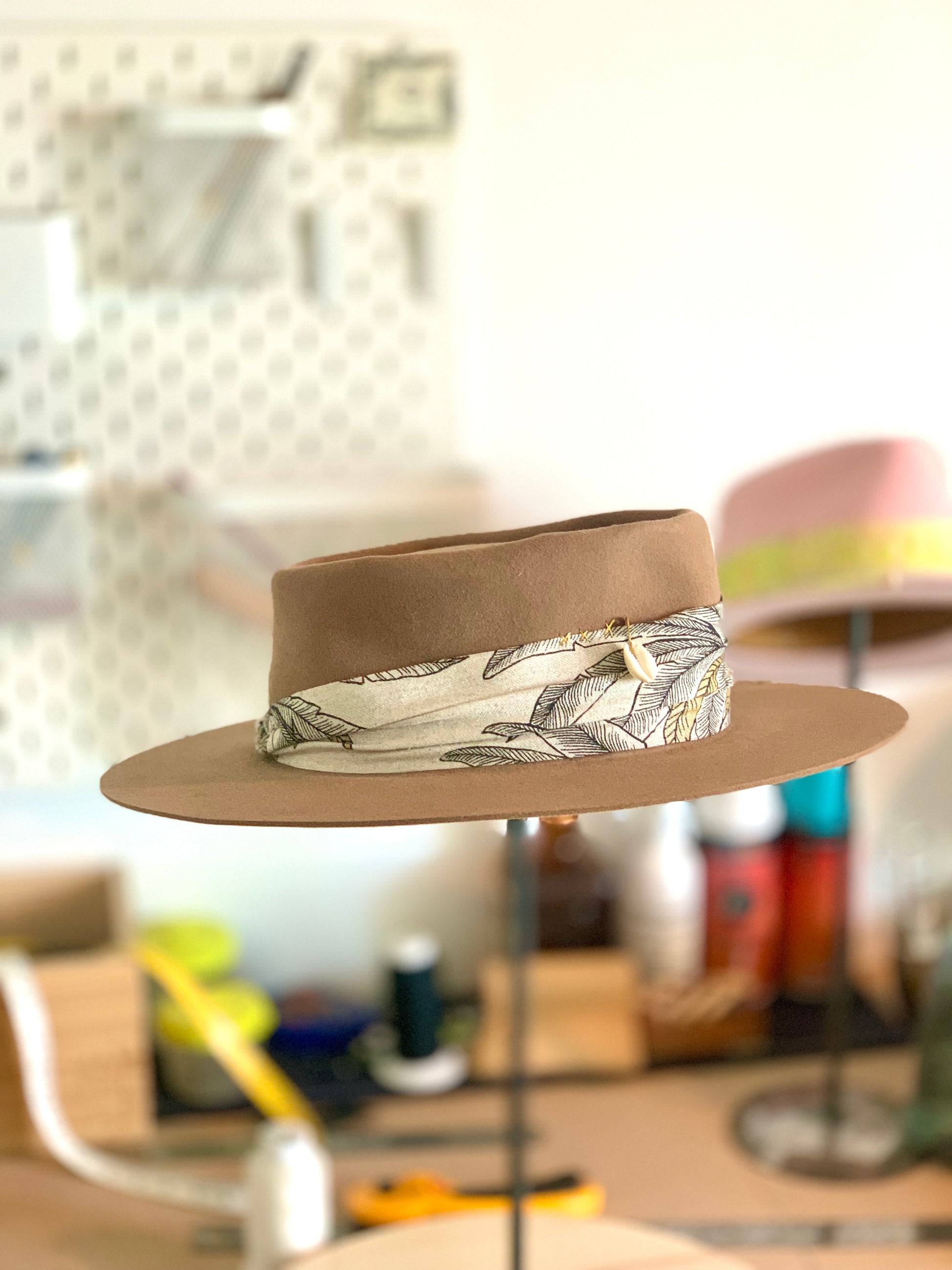 Ce chapeau est agrémenté d’un tissus haute qualité, d’unCyphoma ainsi que d’une plume.